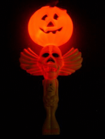 Flashing Halloween Wands play spooky music while flashing. Great giveaway presents. Come in (3) styles: Pumpkin, Witch and Skull.